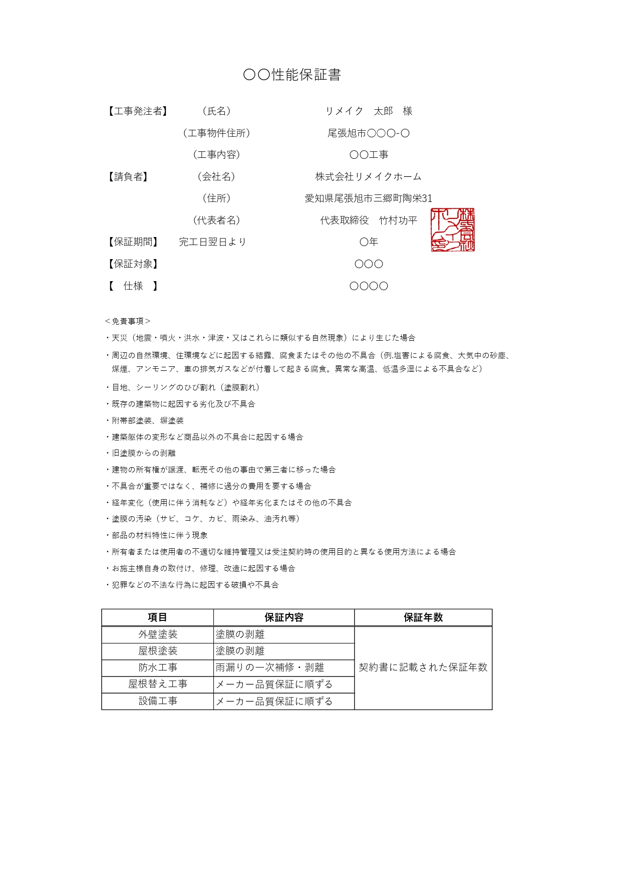 塗装会社が顧客に発行するもので、施工不良による不具合が対象です。