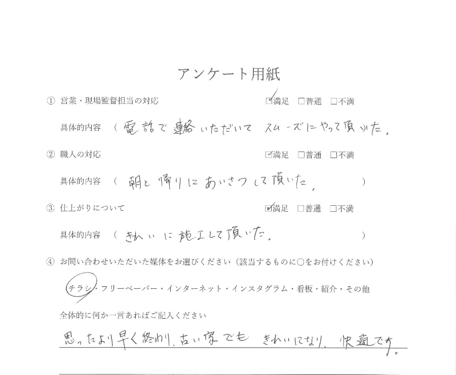| お客様から一言 | 思ったよりも早く終わり、古い家でもきれいになり、快適です。 |