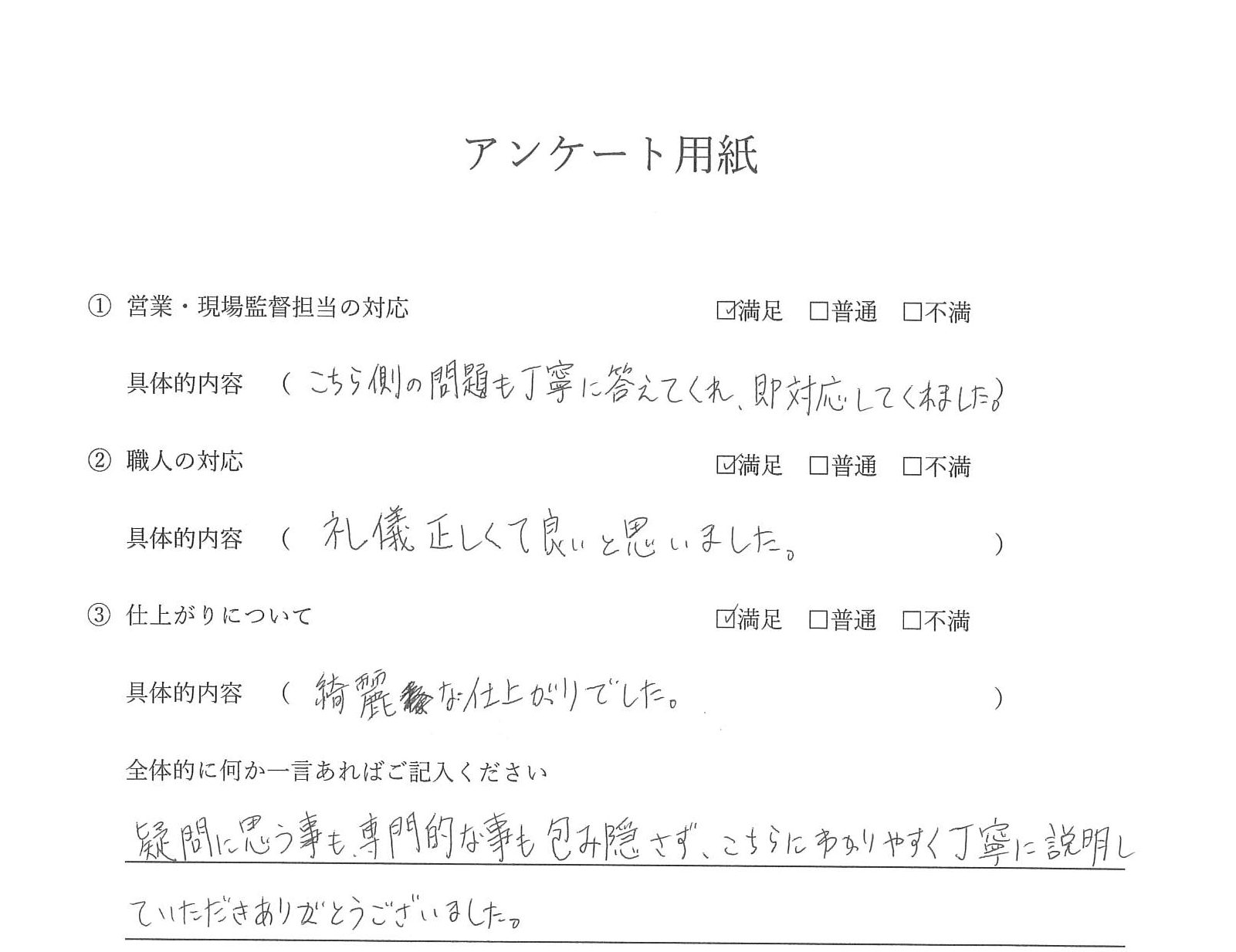 外装工事(外壁塗装・屋根塗装・雨樋交換) 営業・現場担当の対応 満足 こちら側の問題も丁寧に答えてくれ即対応してくれました。 職人の対応 満足 礼儀正しくて良いと思いました。 仕上がりについて 満足 綺麗な仕上がりでした。 お客様から一言 疑問に思う事も専門的な事も包み隠さず、こちらに分かりやすく丁寧に説明していただきありがとうございました。