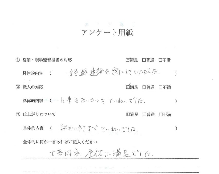 外装工事(外壁塗装・ベランダ防水工事・雨桶取替) 営業・現場担当の対応 満足 経過連絡を密にしていただいた。 職人の対応 満足 仕事もあいさつも丁寧でした。 仕上がりについて 満足 細かい所までていねいでした。 お客様から一言 工事内容全体に満足でした。