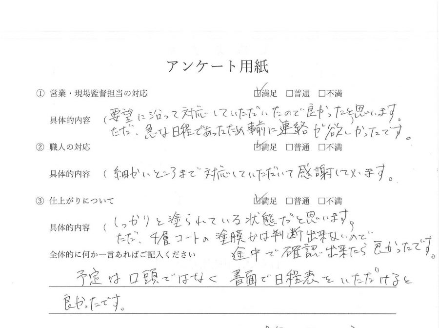 外装工事(外壁塗装) 営業・現場担当の対応 満足 要望に沿って対応していただいたので良かったと思います。ただ急な日程であったため事前に連絡が欲しかったです。 職人の対応 満足 細かい所まで対応していただいて感謝しています。 仕上がりについて 満足 しっかりと塗られていり状態だと思います。ただ4層コートの塗膜かは判断できないので途中で確認出来たら良かったです。 お客様から一言 予定は口頭ではなく書面で日程表をいただけると良かったです。