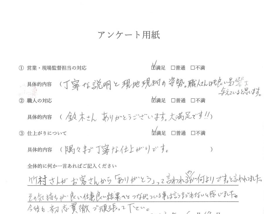 外装工事 (外壁塗装) 営業・現場担当の対応 満足 丁寧な説明と現地現物の姿勢。 職人さんにも良い影響を与えていると思います。 職人の対応 満足 鈴木さんありがとうございます。大満足です!! 仕上がりについて 満足 隅々まで丁寧な仕上がりです。 お客様から一言 竹村さんがお客さんから「ありがとう」って言われるのが何よりです。と言われました。その気持ちが良い仕事良い結果へと繋がっている事は言うまでもないと感じました。今後も初心貫徹で頑張って下さい。