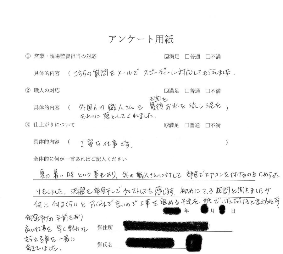 夏の暑い時という事もあり外の職人さんに対して部屋でエアコンを付けるのをためらったりもしました。洗濯も部屋干しで少々ストレスを感じます。初めに2~3週間と聞きましたが何日くらいとアバウトで良いので工事を進める予定を紙でいただけると良かったです。ご近所の手前もあり良い仕事を早く終わって貰える事を一番に考えていました。 |