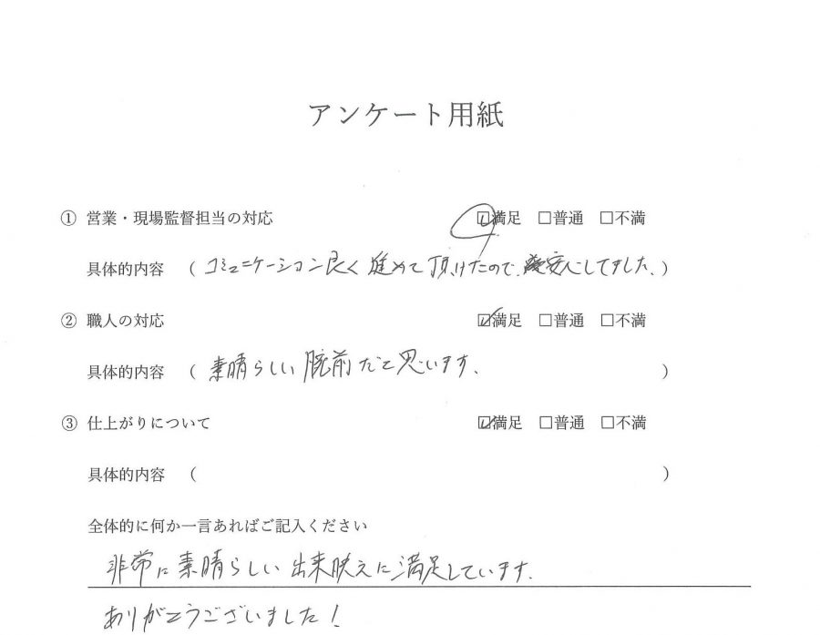 外装工事(外壁塗装・屋根塗装・ベランダ防水工事) 営業・現場担当の対応 満足 コミュニケーション良く進めて頂けたので 安心してました。 職人の対応 満足 素晴らしい腕前だと思います。 仕上がりについて 満足 お客様から一言 非常に素晴らしい出来映えに満足しています。ありがとうございました。