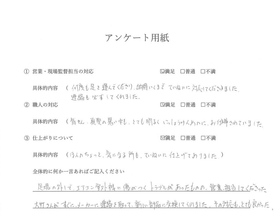 | お客様から一言 | 足場の外しでエアコン室外機に傷がつくトラブルがあったものの営業担当して下さった大竹さんが直ぐにメーカーに連絡を取って新しい部品に交換してくれました。その対応もとても良かった。 |