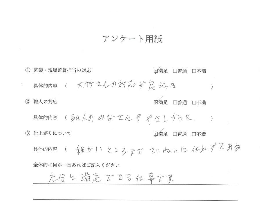 この度は弊社をご利用頂きまして誠に有難うございました。お客様が満足され又お褒めの言葉まで頂きとても嬉しく思っています。この仕事をさせて頂く中で、お客様から頂くお言葉が何よりもの励みになると同時にご縁があって本当に良かったと思う瞬間です。これからもどんな些細なお悩みでも構いませんので、気軽にお声掛け下さい。スタッフ一丸となってご提案させて頂きます。宜しくお願い致します。