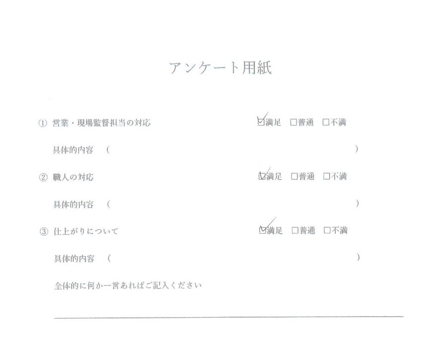 外装工事(外壁塗装・ベランダ防水工事) 営業・現場担当の対応 満足 職人の対応 満足 仕上がりについて 満足 お客様へ この度は弊社をご利用下さいまして誠に有難うございます。今回の工事ではご満足いただけました事大変嬉しく思っております。又この他にも屋根塗装工事、内装工事、雨漏り工事、外構工事、エクステリア工事等も対応させて頂いておりますので今後お住いでお困り事等御座いましたらどんな些細な事でも構いませんのでお気軽にお声掛け下さい。スタッフ一同誠心誠意をもってご対応させて頂きます。