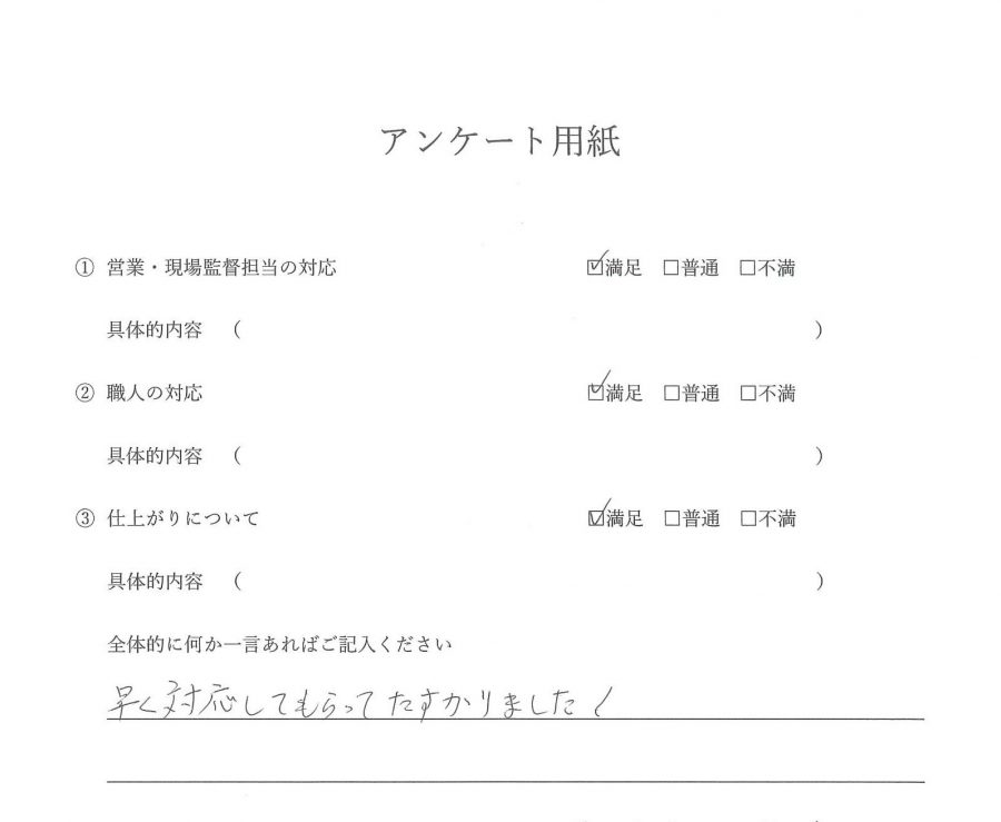 外装工事(ガス給湯器取付工事) 営業・現場担当の対応 満足 職人の対応 満足 仕上がりについて 満足 お客様から一言 早く対応してもらって助かりました。 お客様へ この度は弊社にご依頼頂きまして誠にありがとうございます。その後ガス給湯器はいかがでしょうか?お客様からリフォーム後も満足というお言葉を頂きスタッフ一同大変嬉しく思っております。これからも何かお住いでお困り等ございましたらどんな些細な事でも構いませんのでお気軽にお声掛け下さい。誠心誠意をもってご対応させて頂きます。