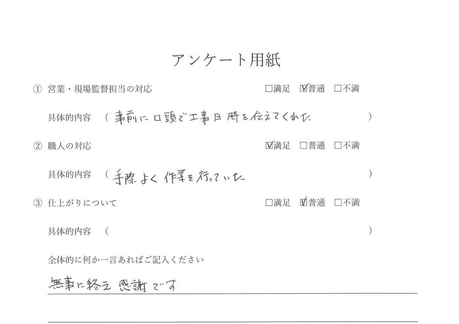 外装工事(雨樋交換工事) 営業・現場担当の対応 普通 事前に口頭で工事日を伝えてくれた 職人の対応 満足 手際よく作業を行っていた 仕上がりについて 普通 お客様から一言 無事に終え感謝です。 お客様へ この度は数あるリフォー店から弊社にお声掛け下さいまして誠にありがとうございます。今後お住いで何かお困り事等ございましたら、お気軽にお声掛け下さい。お客様に納得のいくプランをご提供させて頂きます。