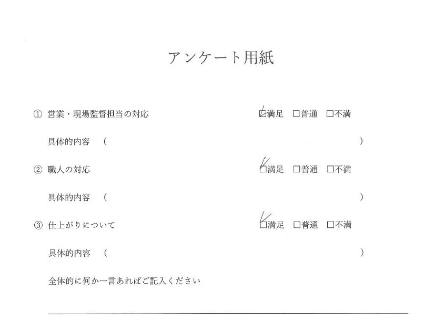 外装工事(外壁塗装工事・ベランダ防水工事) 営業・現場担当の対応 満足 職人の対応 満足 仕上がりについて 満足 お客様へ この度は弊社にリフォーム工事のご依頼を下さいまして誠にありがとうございます。又工事後ではお客様より満足と言う評価を頂きスタッフ一同大変嬉しく思っております。お客様より頂きましたご縁を大切にしていきたいと思っておりますので何かお住いでご心配等ございましたらいつでもお声掛け下さい。スタッフが誠心誠意をもってご対応させて頂きますので今後共どうか宜しくお願い申し上げます。