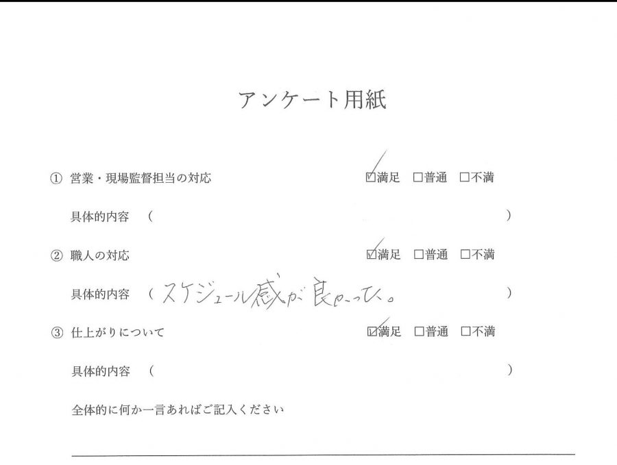工事が終わった後、担当者からのアフターフォローも安心できるものでした。施工後の点検や、メンテナンスに関するアドバイスをいただき、今後の管理についても心強く感じています。リメイクホームのスタッフは、ただ施工を行うだけでなく、私たちの家を大切に考えてくれているのだと感じました。こうした細やかな配慮は、私たちの信頼を深める要因となりました。
