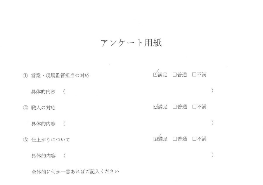 この度は、外壁塗装・屋根塗装工事をご依頼いただき、誠にありがとうございました。工事に際し、営業および現場担当、職人の対応にご満足いただけたとのお言葉を頂戴し、スタッフ一同大変嬉しく感じております。また、仕上がりにもご満足いただけたことは、私たちにとって大きな励みとなっております。今後とも、さらにご満足いただけるサービスを提供できるよう努めてまいりますので、何かご不明な点やお気づきのことがございましたら、いつでもご連絡ください。どうぞ末永いお付き合いをお願い申し上げます。ありがとうございました。