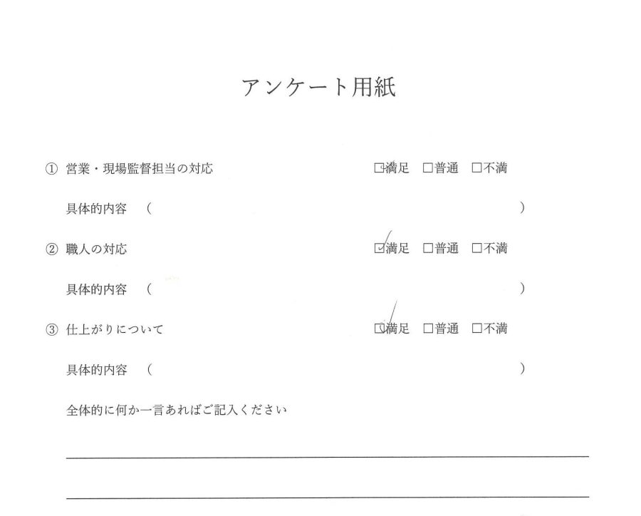 さらに、施工後のアフターフォローもしっかりしており、万が一問題があった場合に迅速に対応していただけるとのことなので、今後も安心して過ごせそうです。担当の方からも、施工後にしっかりと点検を行っていただけるとのことで、何か気になる点があればすぐに連絡してくださいと言ってもらえたので、非常に心強いです。