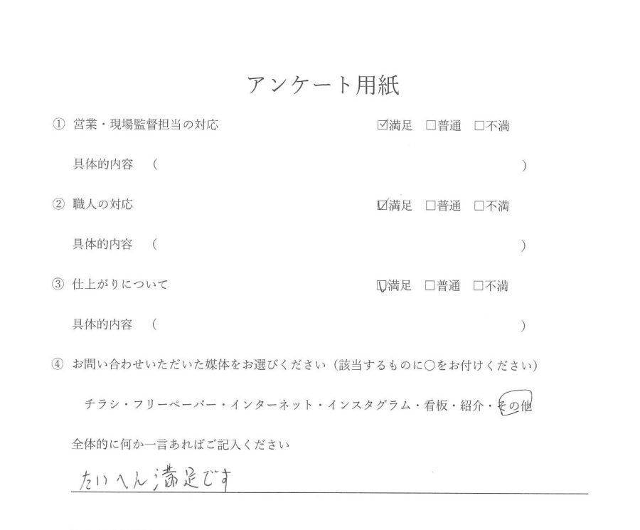 この度は、屋根カバー工法工事をご依頼いただき誠にありがとうございました。営業・現場監督の対応、職人の対応、そして仕上がりについてご満足いただけたとのこと、大変嬉しく思います。お客様に安心して工事をお任せいただけるよう、事前の打ち合わせから施工完了まで丁寧な対応を心がけましたので、このようなお言葉をいただけることが何よりの励みになります。また、お客様からは、大変満足ですとのお言葉をいただきスタッフ一同大変嬉しく思っております。屋根カバー工法は、既存の屋根を撤去せずに新しい屋根材を重ねることで、耐久性を向上させつつコストや工期を抑えられるメリットのある工事です。今回の工事で、お住まいの屋根がより長持ちし快適にお過ごしいただけることを願っております。今後もお客様の大切なお住まいを守るため、最適なご提案と丁寧な施工を心がけてまいります。何か気になることやご相談がございましたら、いつでもお気軽にご連絡ください。今後ともどうぞよろしくお願い申し上げます。