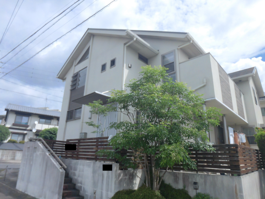 施工前は、外壁全体に色あせや汚れが見られ屋根も経年劣化により割れや亀裂が目立つ状態でした。その影響で、建物全体が少し重たく、くすんだ印象になっていました。施工後は、外壁を明るくやわらかなクリーム色に仕上げたことで、住まい全体が一気に明るく清潔感のある印象へと変わりました。屋根はダークグレーで仕上げ、外壁の明るさを引き締めることで落ち着きと高級感のある外観に仕上がりました。コントラストの効いた配色により建物の輪郭もはっきりとし、以前よりも立体感のある外観へと変わりました。