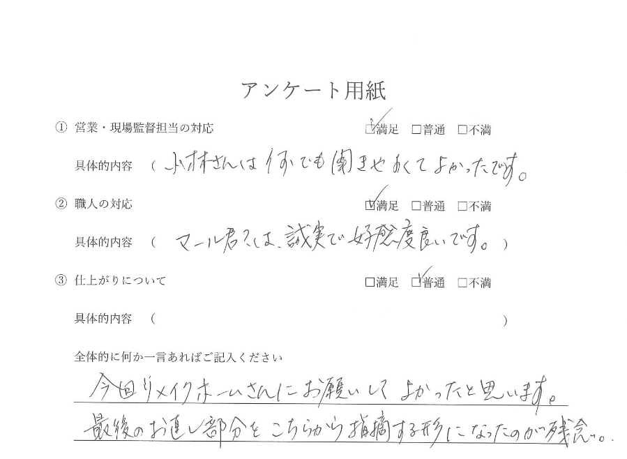 今回リメイクホームさんにお願いしてよかったと思います。最後のお直し部分をこちらから指摘する形になったのがの残念。