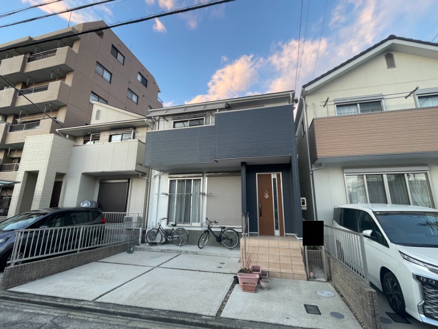 施工前は、全体的に色あせやツヤ引けが見られ、当初の印象よりも少しぼんやりとした雰囲気になっていました。配色自体は気に入っていらっしゃいましたが、経年劣化により本来の美しさやコントラストが弱まり、お住まい全体の印象がやや重たく感じられる状態でした。今回の工事では元のイメージは大きく変えずに、新鮮さを加えたいというご希望を大切にし、何通りかのカラーシミュレーションを作成。その中からじっくりご検討いただき、最終的にご納得いただいた配色で塗り替えを行いました。仕上がりは、深みのあるダスクグレーとホワイトの組み合わせにより、洗練された印象へと一新。以前の雰囲気を踏襲しながらも、色のコントラストがはっきりと際立ち、艶のある美しい外観に生まれ変わりました。落ち着きの中にも上質さを感じさせる佇まいとなり、お住まい全体がぐっと引き締まった印象です。変えすぎないけれど、確実に美しくなった、そんな理想的なビフォーアフターとなりました。