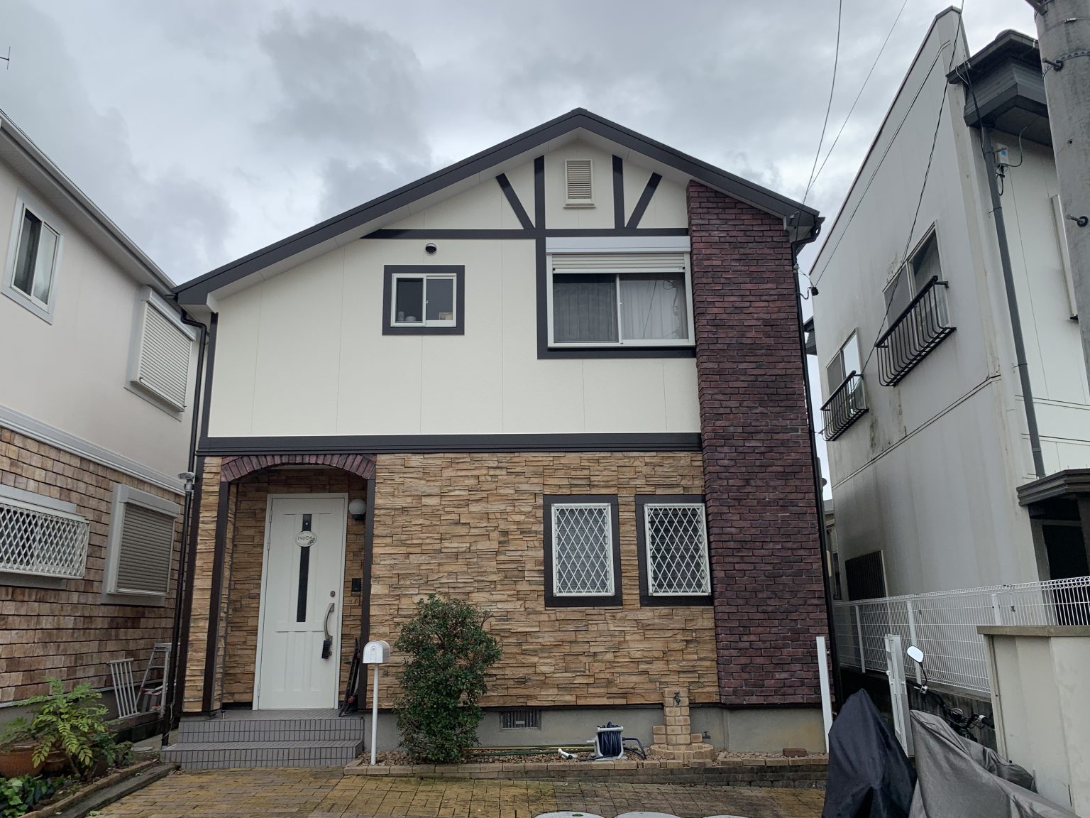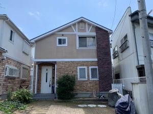 こちらのお宅は1F前面にタイルが貼られており、タイルの部分と塗装する部分の取り合いのライン出しが非常に難しかったです。さらに既存の塗装の色と違う色で塗装することになった為尚一層ライン出しに注意が必要でした。丁寧に仕事をしたこともあり、お客様も仕上がりには大変喜んで頂けてよかったです。