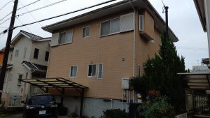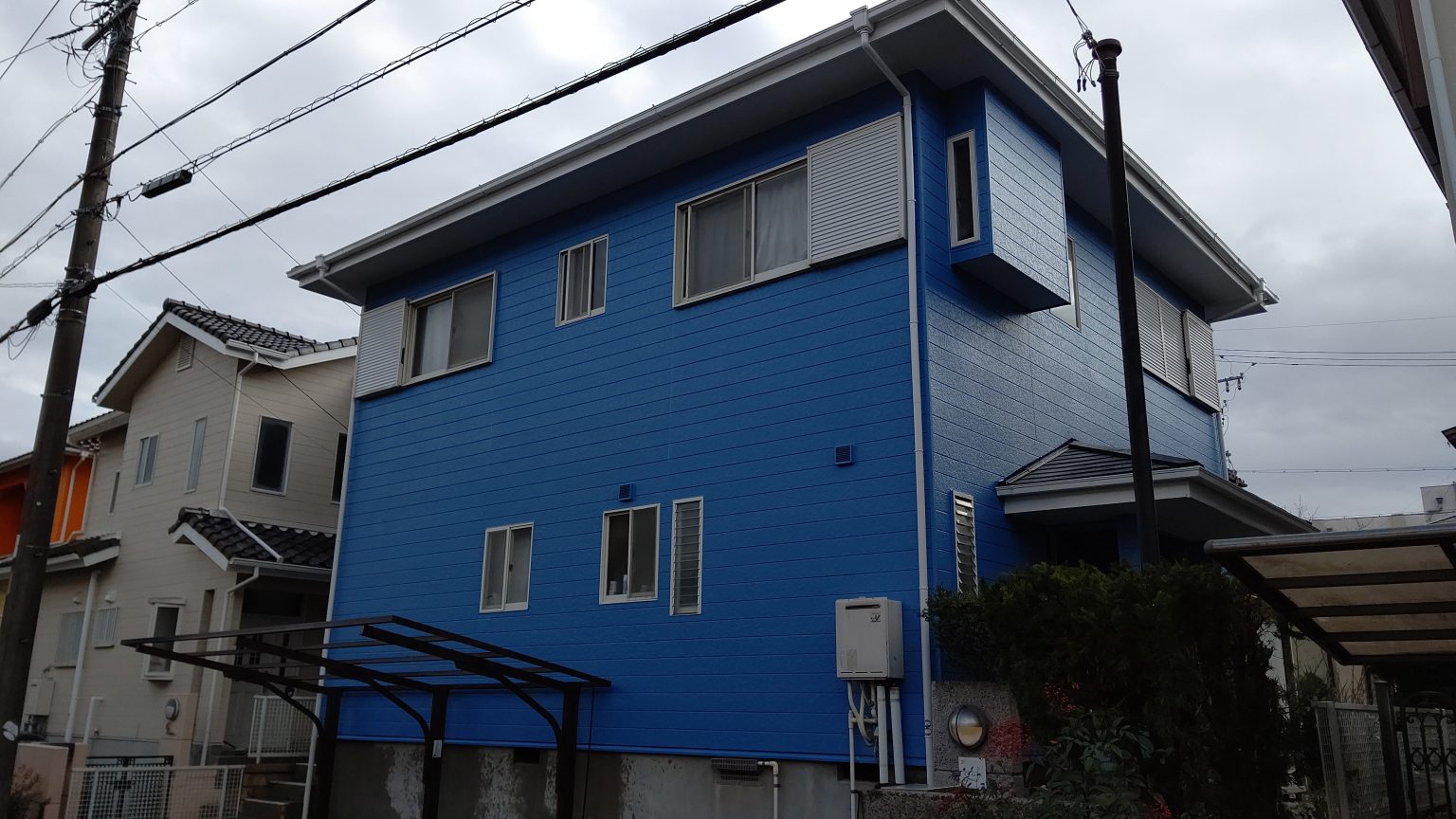 外壁塗装は下塗りにサイディングボード専用の下塗り材である、日本ペイントのパーフェクトサーフを使用して、微細なクラックの修繕や上塗り塗料の吸い込み防止を行い、中塗りは色を変えて塗装を行い、そこから再度色を変えて上塗りを2度行い合計4回塗装を行いました。