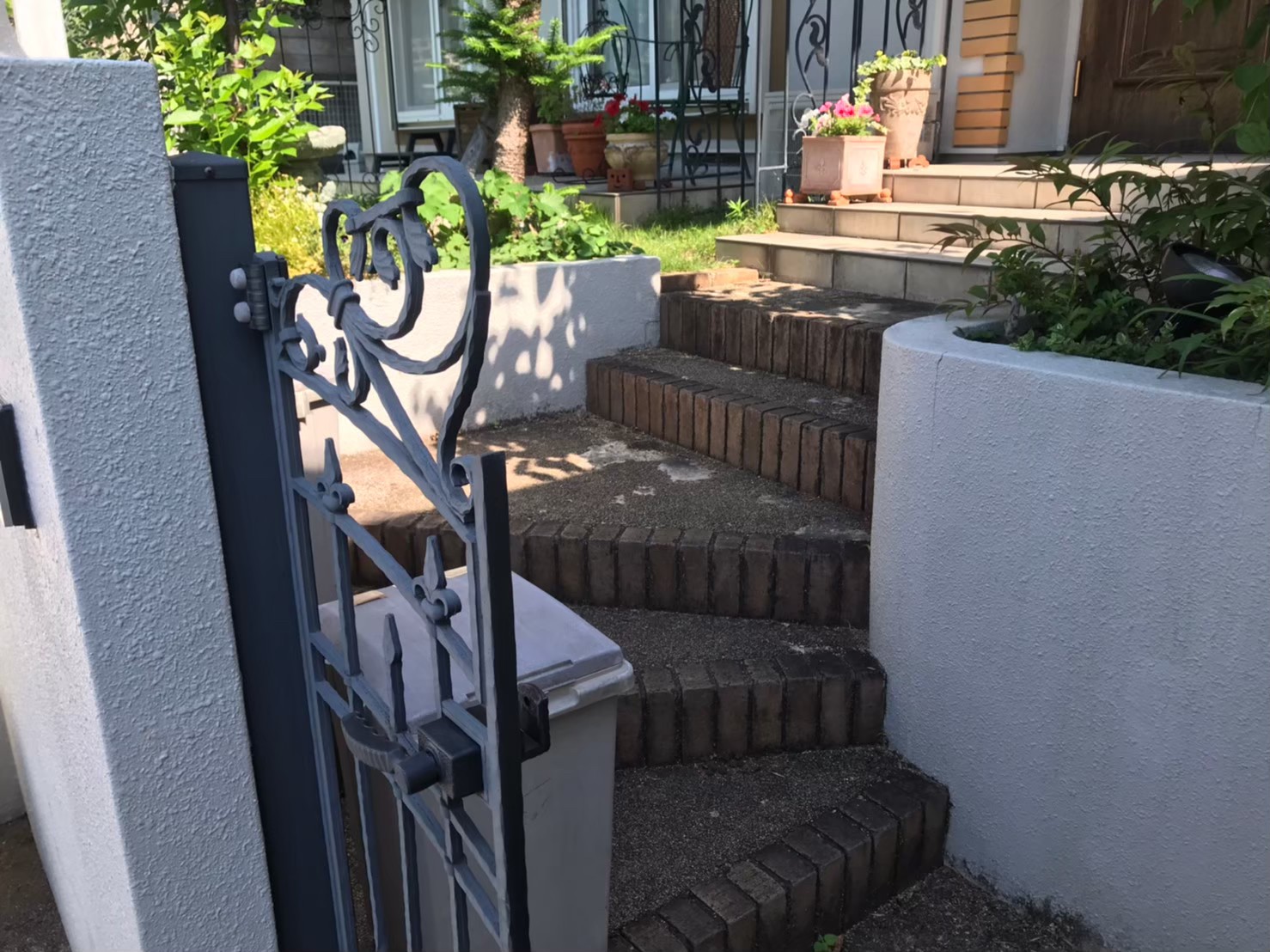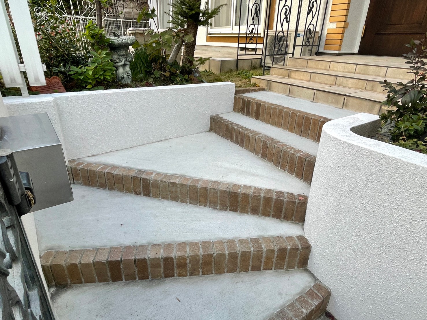 階段アプローチはリンクストーンを使用されており、表面が剥がれてきていた為、お客様のご要望でモルタルコンクリートに改修させて頂きました。