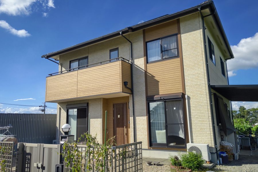 木目柄の外壁は経年劣化によち下地が傷んでいたので下塗りでサフェーサーを塗布してヘアークラックを埋めてから上塗りを行わせて頂きました。