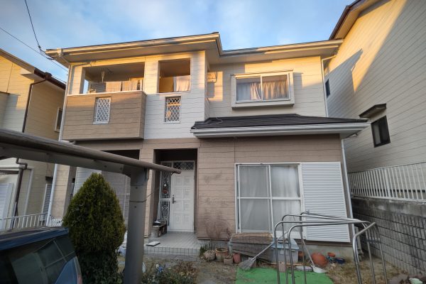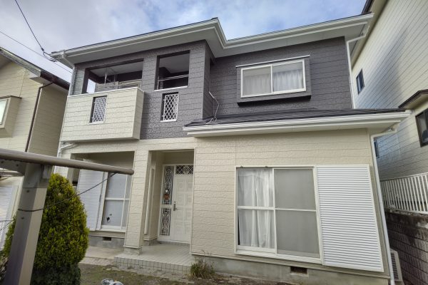 元々ツートンで塗装しておりましたが、今回は2階部分に落ち着いた配色の塗装をさせて頂きお家もモダンな雰囲気に変わり大変カッコい良いお家に生まれ変わりました!
