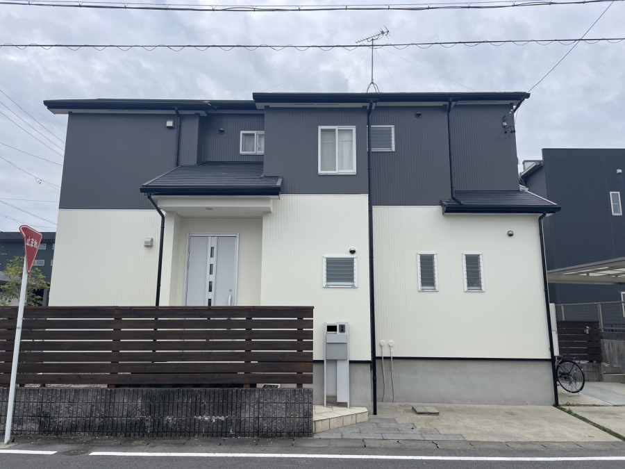 もともとは外壁のコーナー部分にパターンの違う外壁を張っていたので、そこで外壁の色が変わっていましたが、今回再塗装を行う際に上下のツートーンに色分けをすることをご要望されたため、上下ツートーンで外壁の色を塗り分けました。