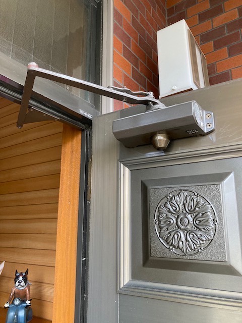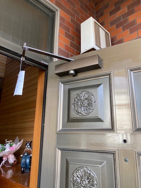 こちらのお宅はトタンを一部上張り工事を行いました。雨仕舞をよくするために1階から2階にかけて一枚のガルバリウム鋼板で施工しました。また、ドアクローザーが老朽化により勢いよく扉が閉まって危なかったのでお客様の要望によりドアクローザーの交換も行いました。
