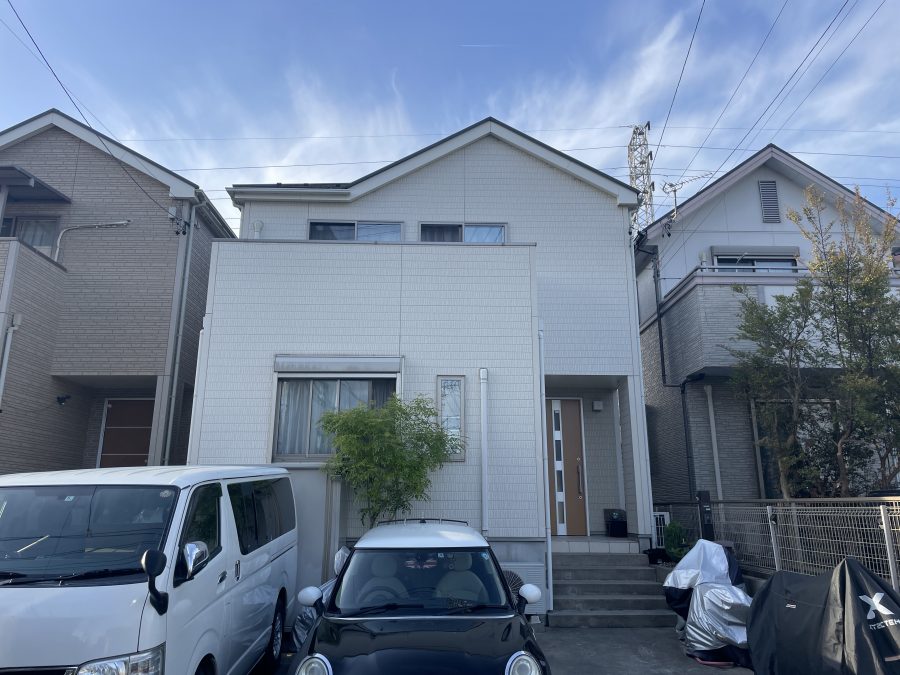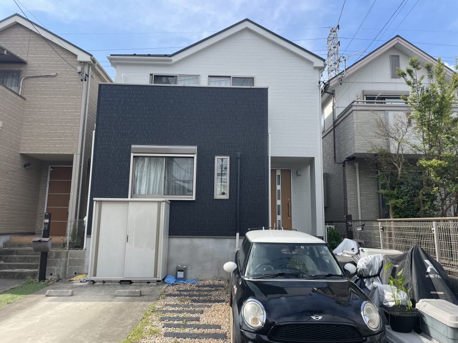 外壁塗装では既存の塗装とあまり変えないイメージを希望されていた為、色の薄い外壁部分にはホワイト系の色を塗装し、濃い方の外壁にはダークグレーの塗料を塗装しました。またカーポートは迫力のあるブラックを採用し間口一杯の3台用のカーポートを設置しました。