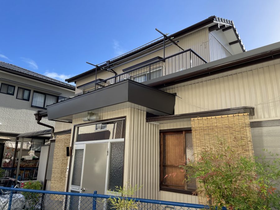 施工前、剥がれ落ちていた軒天は張替えてきれいに、外壁も錆や塗膜剥がれが多くありましたが、しっかりとケレンを行い、丁寧に塗装致しました。一番の優先事項だったテラス屋根は柱の腐食部を撤去、雨水が入らないように、隙間を板金で閉じ、腐食の心配のないアルミの新しいテラス屋根を設置しました。