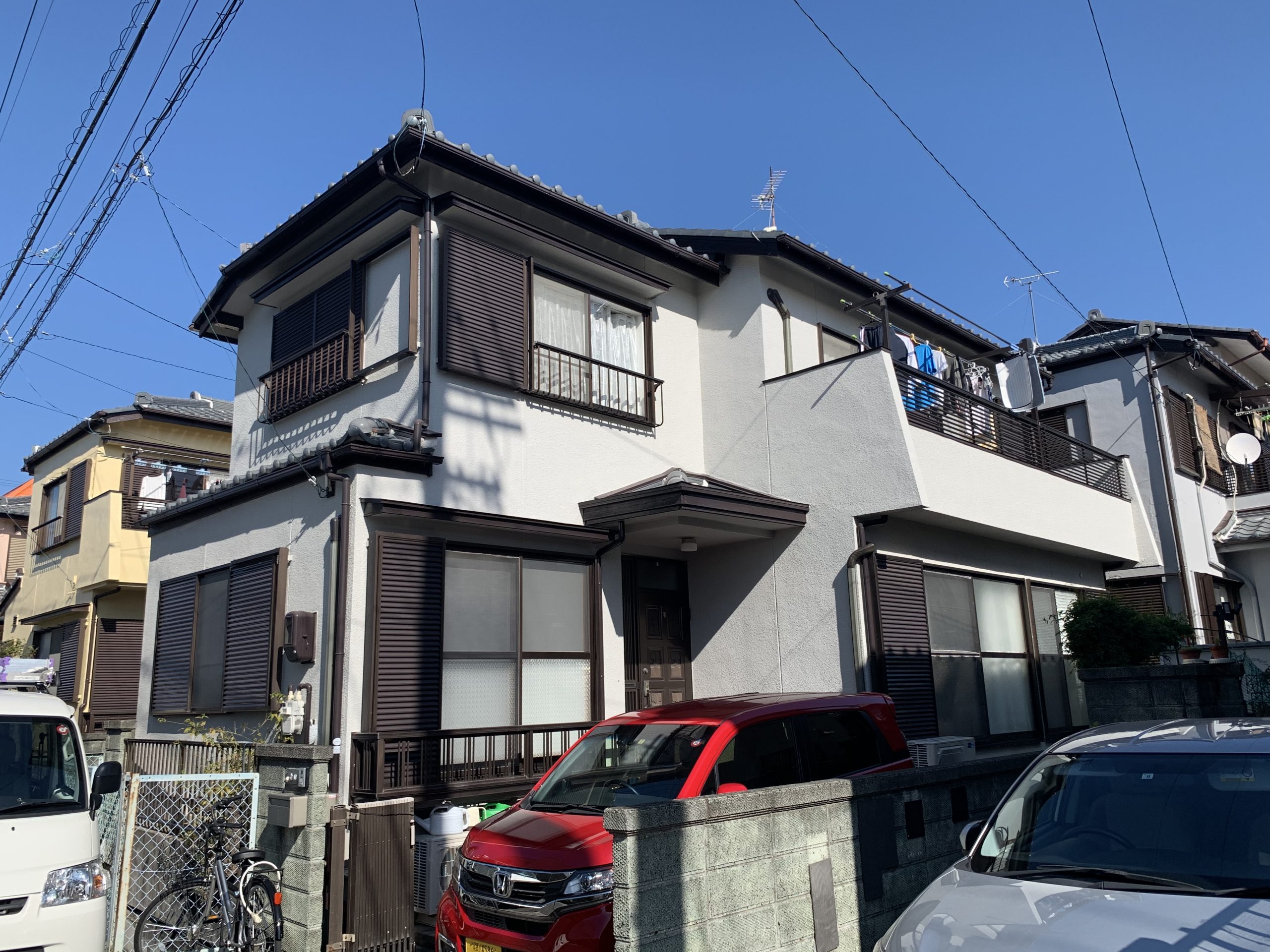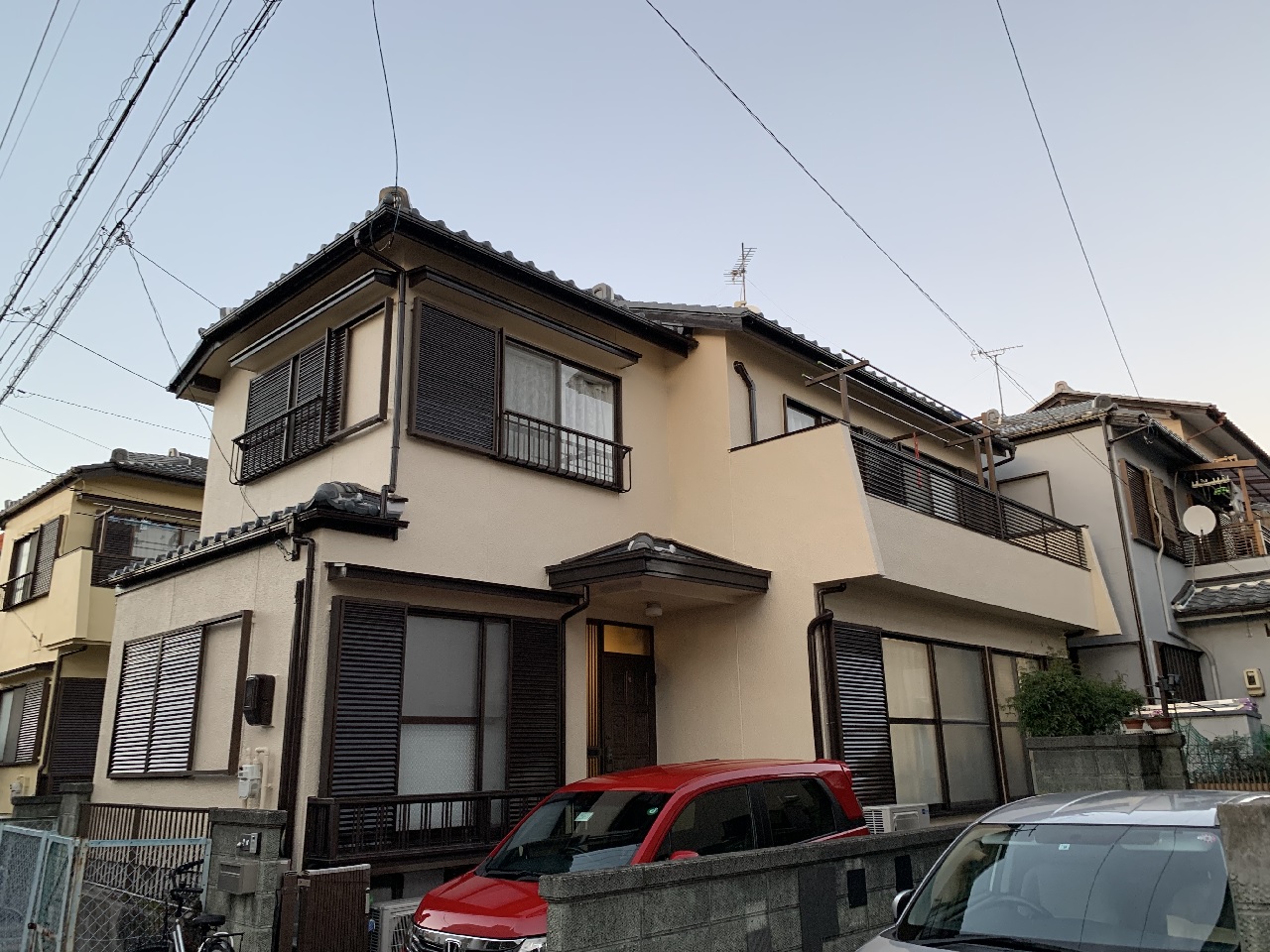 こちらのお宅は築30年のお宅で、オーナー様は中古で購入されました。不動産屋さんが道路沿いの外壁だけ塗装しておられて、それ以外はそのままになっていた為、塗り直す時にムラにならないような気にしながら下地を厚く塗るように工夫しました。材料が通常の3回塗りの2.5倍使用しましたので、厚塗りでさらに耐久性アップ⤴️です笑