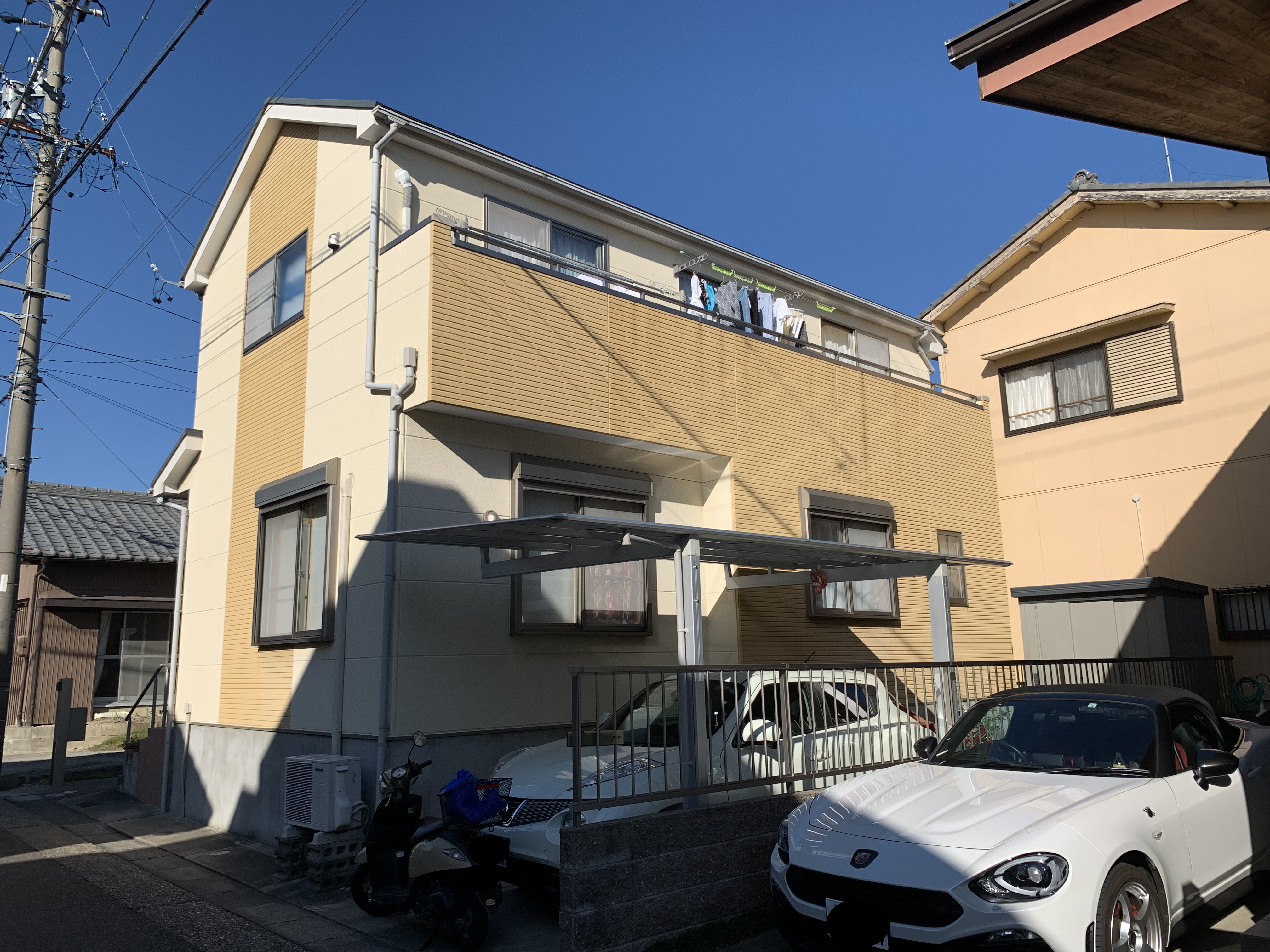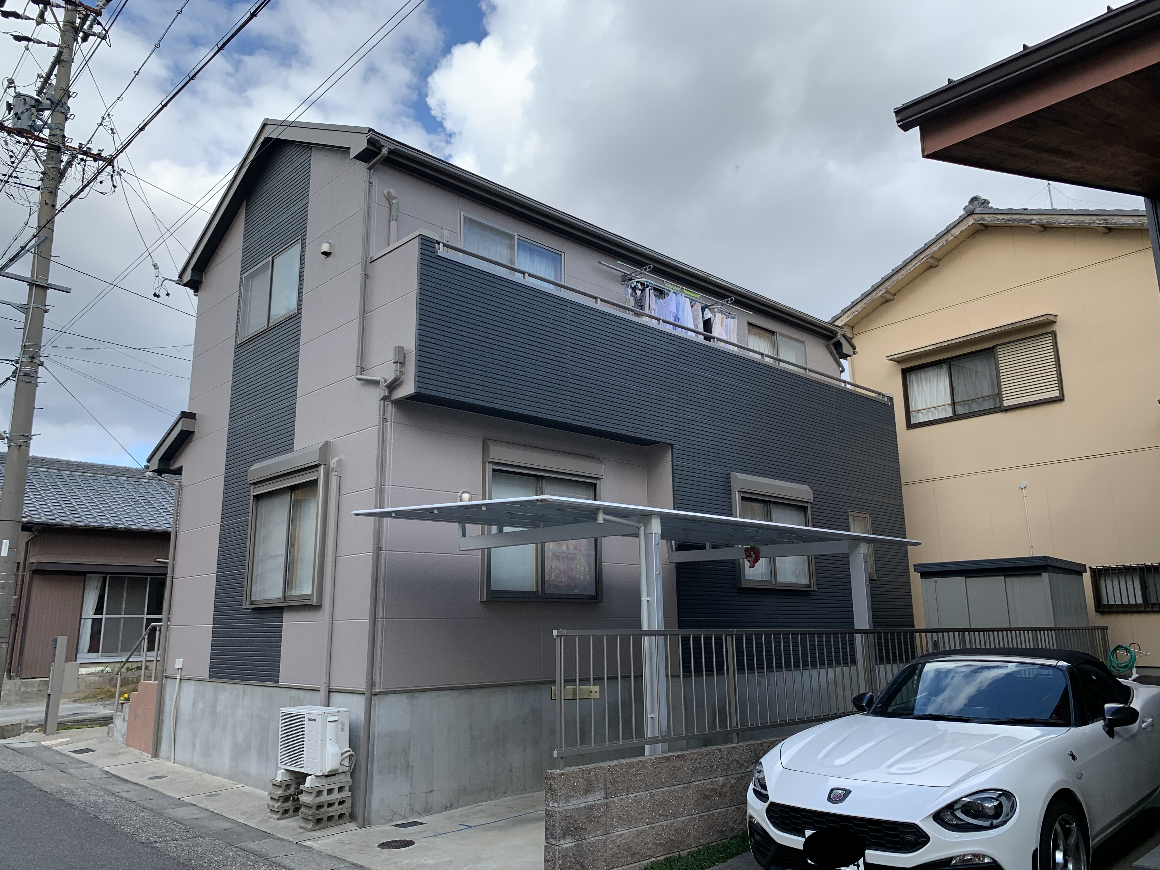 こちらのお宅は外壁の素材にALCボードを使用し色をリシンという塗料で色を付けて新築されていました。リシンは寒水石(かんすいせき)と珪砂(けいさ)という骨材を混ぜた塗料でトゲトゲした表面の仕上がりになる為コケやカビが付きやすくなっていました。そこで今回注意した点は汚れなどが付着しにくい下地調整を行い、塗料の選定をしました。またベランダの下部が居室になっていた為防水工事もご提案し施工させて頂きました。