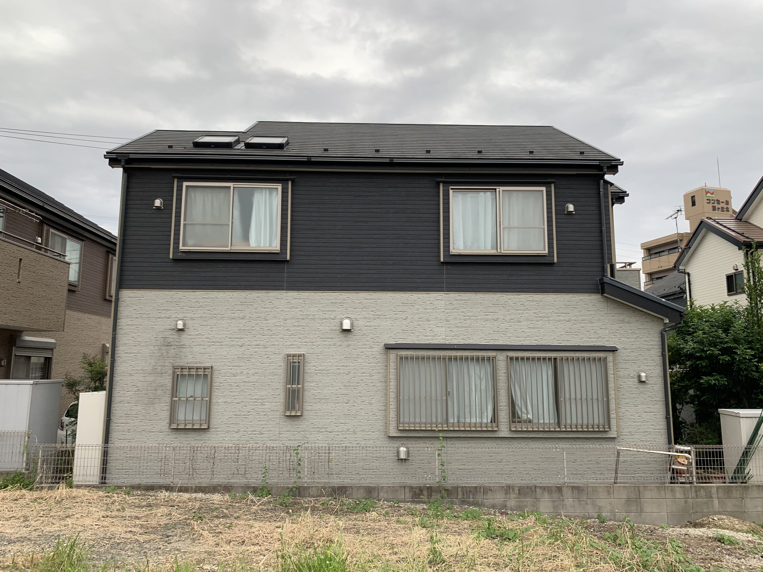 現状の建築物の2階の外壁の色が黒系で、お客様が塗り替えでお選び頂いた外壁の色が白系でしたので、3回塗で色が付くか不安でした。一般のお客様はよく『何回塗をする?』と聞かれますが、塗回数は最低でも3回塗りを行いますが、場合によっては4回5回と塗装しないと色や艶が出ない場合もあります。こちらのお宅も外壁の模様や既存の色の関係でやはり色が出ず、何回も塗り直しを行い、5回塗りになってしまいました。良い仕上がりする為、ただ3回塗るだけではなく丁寧に確認検査を行いました。