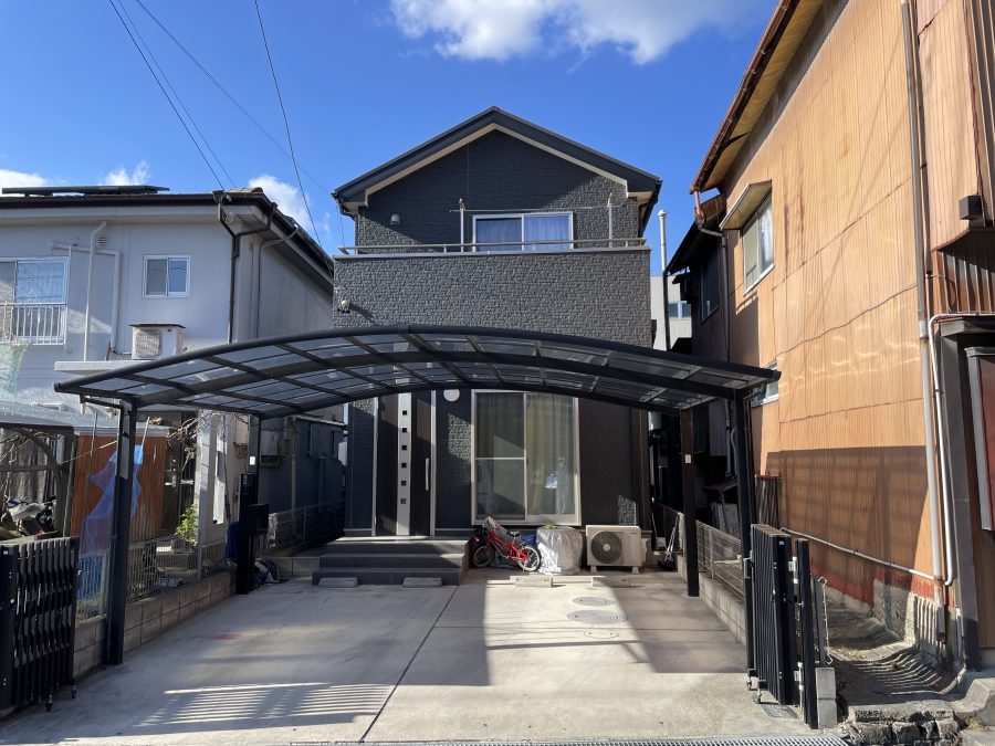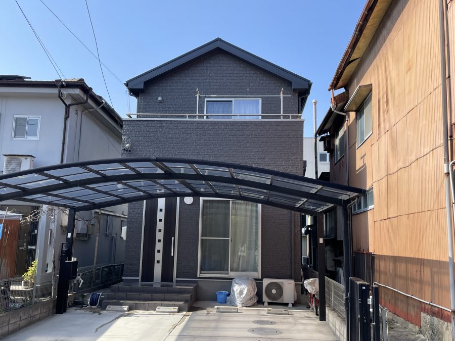 施工前のダークグレーから、オータムブラウンへとやわらかい色へ変更しましたが、白かった軒天をダークグレーにすることで、落ち着いた雰囲気に変わりました。