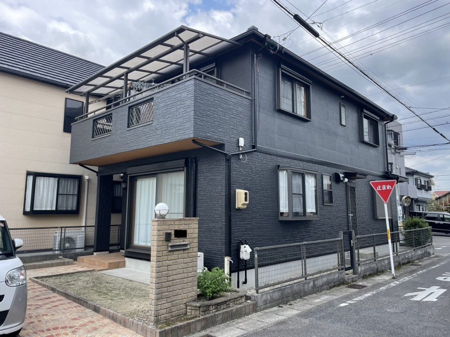 塗装の過程では、下塗りを2回行った後、中塗り、上塗りと進められ、特に劣化の激しかった南面も均一で美しい仕上がりとなりました。外壁の色はダークグレーのワントーンで統一し、シックで落ち着いた印象に変わりました。また、軒天には木目調のカラーを取り入れ、まるで新築物件のようなモダンな仕上がりにしていただきました。