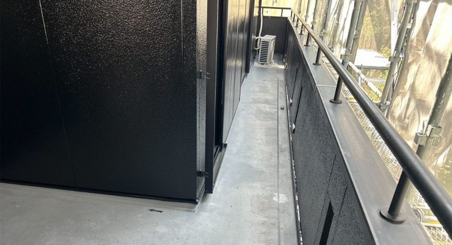 外壁塗装、屋根カバー工事、ベランダ防水、帯板金を順番に作業させて頂きました。