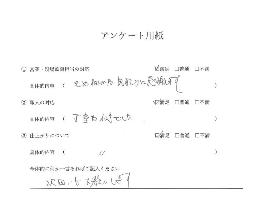 この度は、外壁塗装・屋根カバー工法・ベランダ防水工事をご依頼いただき、誠にありがとうございました。営業および現場監督担当につきまして、きめ細かな気配りに感謝しますとの温かいお言葉をいただき、大変嬉しく感じております。日程の調整や工事の進行状況についてこまめにご連絡し、スムーズに工事を進められるよう努めてまいりましたが、ご満足いただけたとのことで何よりです。また、職人の作業・仕上がりについて丁寧な仕事でしたとご評価いただき、誠にありがとうございます。塗装面の仕上がり、屋根カバーの施工、ベランダの防水処理に至るまで一つひとつの工程を細やかに仕上げることを心掛けており、お客様に安心してご使用いただける仕上がりを、ご提供できたことを大変光栄に存じます。次回もお願いしますとのお言葉を励みに、今後も高品質なサービスの提供を目指してまいります。またのご依頼を心よりお待ちしております。ありがとうございました。