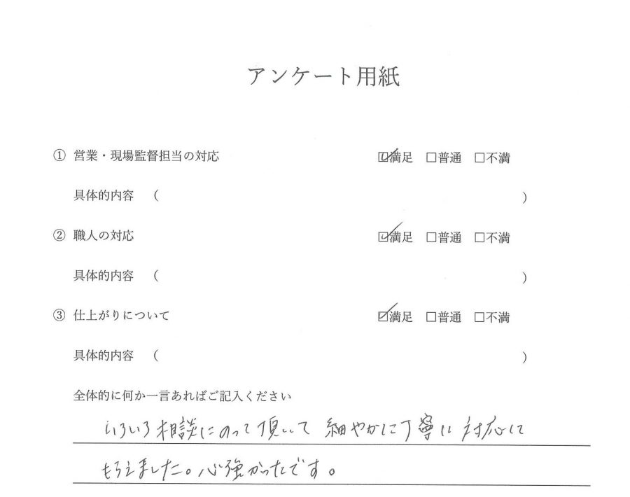 この度は弊社をご利用くださいまして誠にありがとうございました。又リフォーム後はお客様から満足のお言葉や心温まるお褒めのお言葉を頂きスタッフ一同大変嬉しく思っております。又何か御座いましたらどんな些細な事でも構いませんのでお気軽にお申し付け下さい