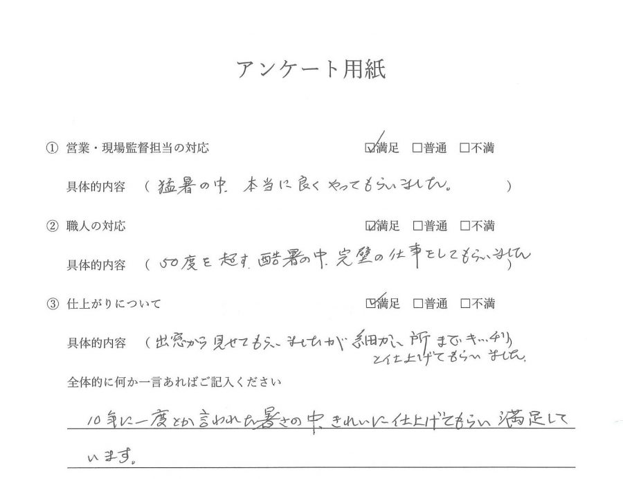 先日は、屋根重ね葺き工事をお願いしました。猛暑の中での作業にもかかわらず、スタッフの皆様が本当に熱心に、そして丁寧に作業を進めてくださり、心から感謝しています。