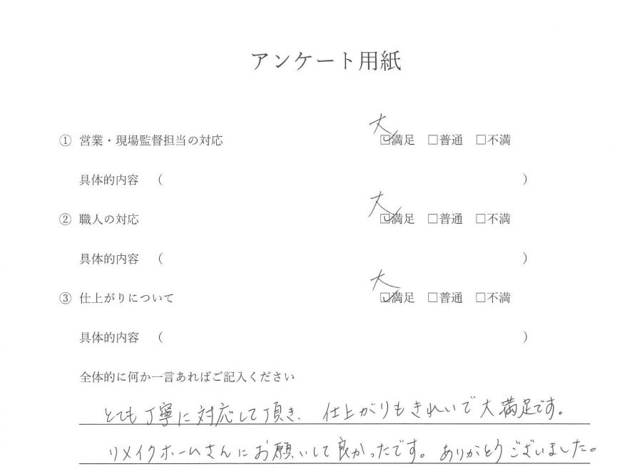 対応も含めて、職人さんに対してもお褒めのお言葉を頂きました。仕上がりも満足頂き、喜んで下さいました。