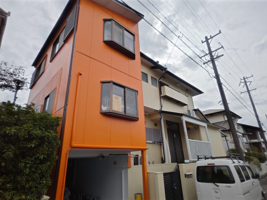 外壁は明るいオレンジ色を採用したことで、建物全体が華やかな印象に変わりました。屋根も新しいブラックカラーで塗装され、全体的にモダンで引き締まった雰囲気となりました。
