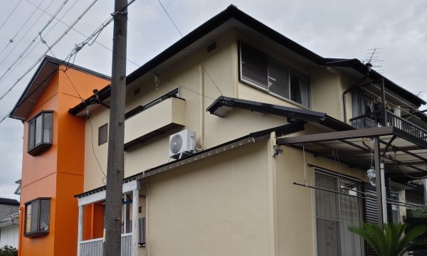外壁はアイボリーとオレンジ色で塗装し、明るく華やかな印象に仕上げました。屋根はブラックに塗装し、全体の印象を引き締めました。外壁のクラック補修を丁寧に行い、屋根の下塗りも2回実施することで、耐久性と仕上がりの美しさにこだわった作業を行いました。