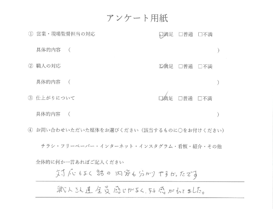 アンケートにも記載しましたが、職人さんたち全員がとても感じの良い方ばかりで、毎日の挨拶や対応にも好感が持てました。