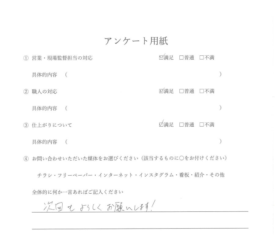 今回、まとめて工事をお願いしましたが、どれも生活の質を上げてくれるものばかりで、本当に満足しています。リメイクホームさんにお願いしてよかったと心から思っています。また何か家のことで相談したいことが出てきた際には、迷わずお願いしたいと思います。