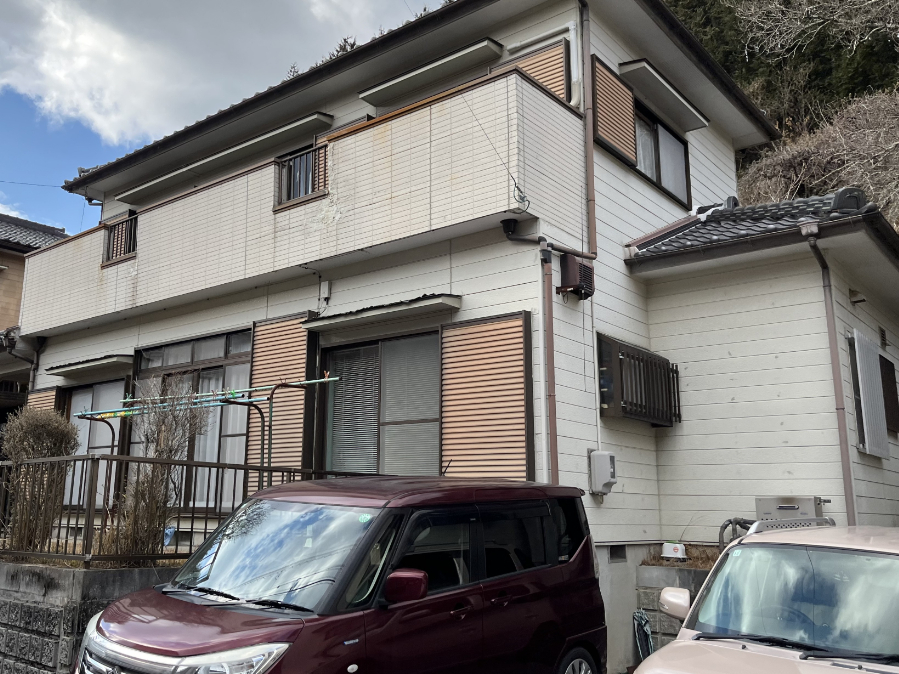 外壁はチョーキングや色褪せが進行し、防水性能が低下していました。ベランダ外壁の一部には腐食や浮き、屋根の漆喰もひび割れが見られるなど、全体的に経年による劣化が進んでいる状態でした。