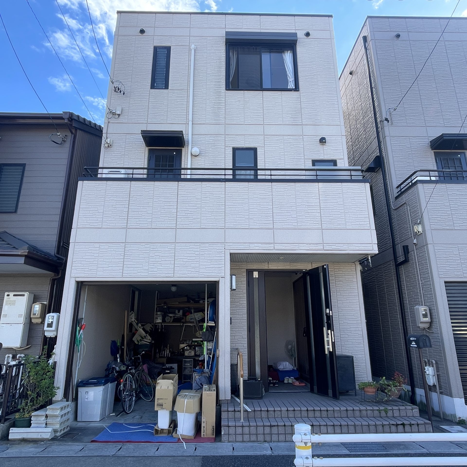 まず高圧洗浄で汚れを丁寧に落とし、劣化していたシーリングを打ち替え、下塗り・中塗り・上塗りと工程を順に進めました。