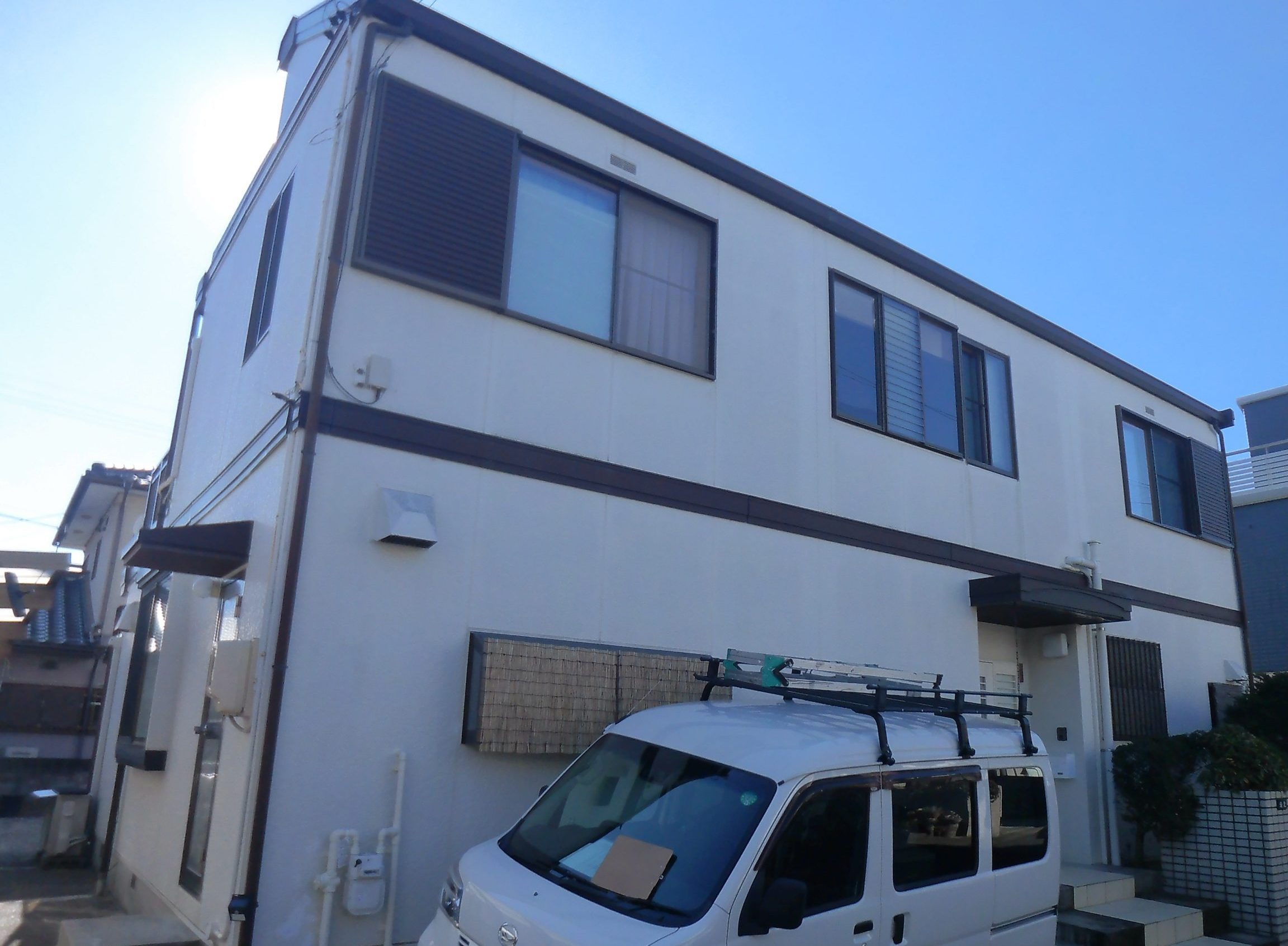 外壁のひび割れやシーリングの劣化部を丁寧に補修したうえで、無機塗料を使用し高耐候性の仕上げを行いました。屋根はスレート部分に加え、付属の折半屋根も無機塗料で塗装し、統一感と防錆性を両立。