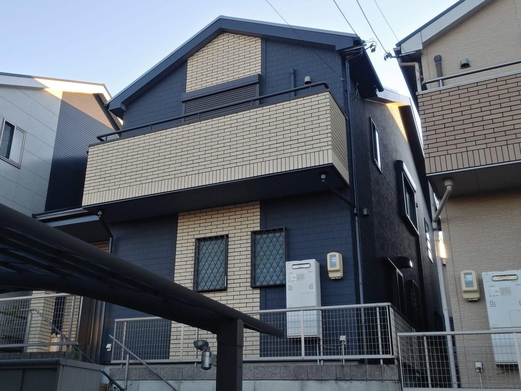 アフターでは、外壁は濃いダークグレーに塗り替えられ、モダンで落ち着いた印象に変化しました。一方、屋根は明るい色合いを選択することで、全体のバランスが取れたデザインとなりました。防水工事も行ったことで、実用性と美観の両立が実現しました。
