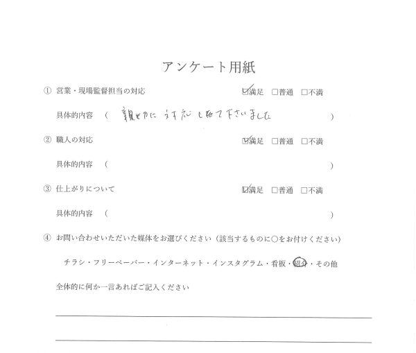 完成後、家族全員で仕上がりを見て大変満足しております。工事が終わった後もアフターフォローについて丁寧に説明していただき、今後のメンテナンスに関しても安心しています。