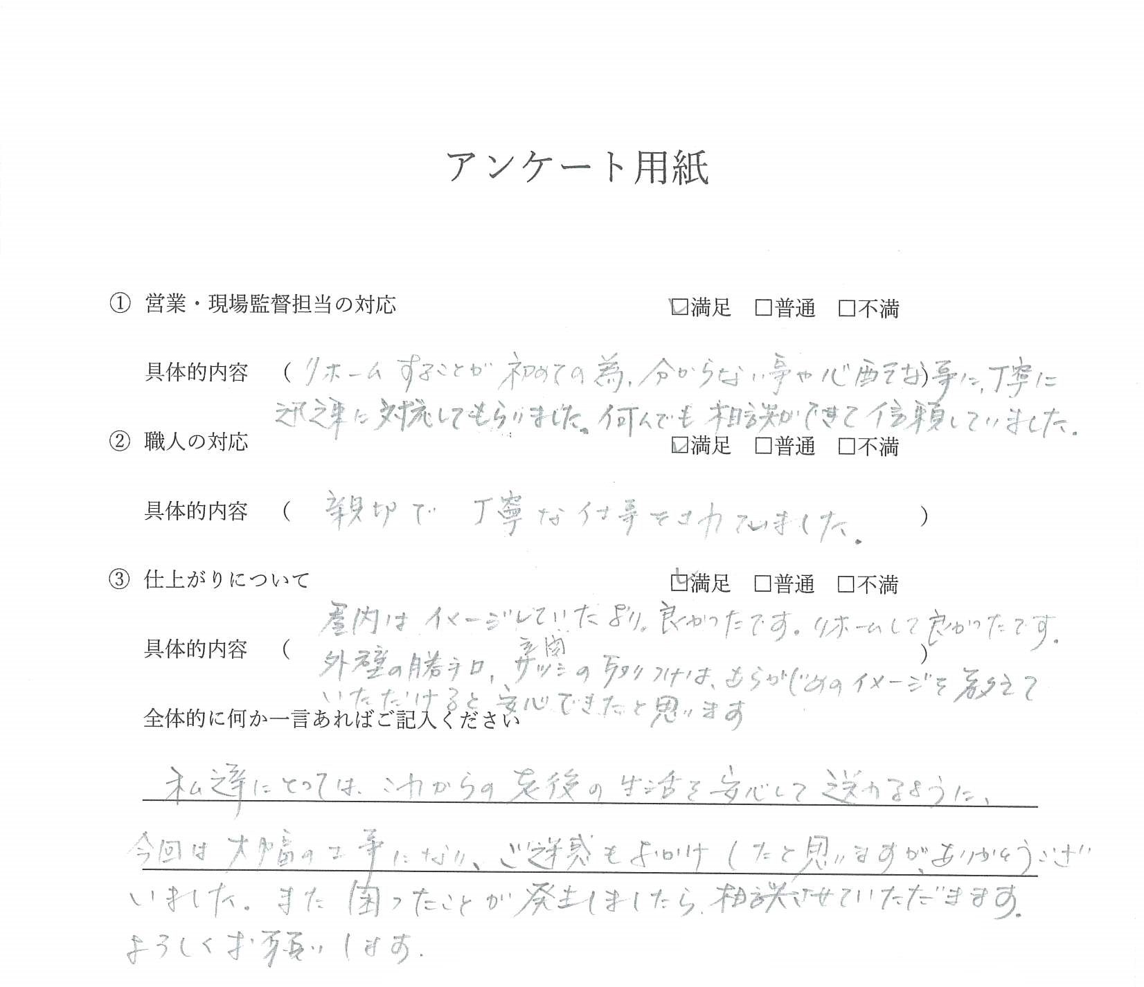 初めてのリフォームで分からないことばかりでしたが、担当の方が非常に丁寧に説明してくれたので、どんな些細な質問にも気軽に相談でき、信頼感が持てました。そのおかげで、リフォーム後の仕上がりに非常に満足しています。
